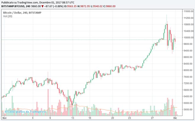 Nel momento in cui scriviamo il prezzo del Bitcoin si trova in prossimità dei 10.000 dollari, in calo dai massimi storici raggiunti il 29/11 a 11.342 dollari.