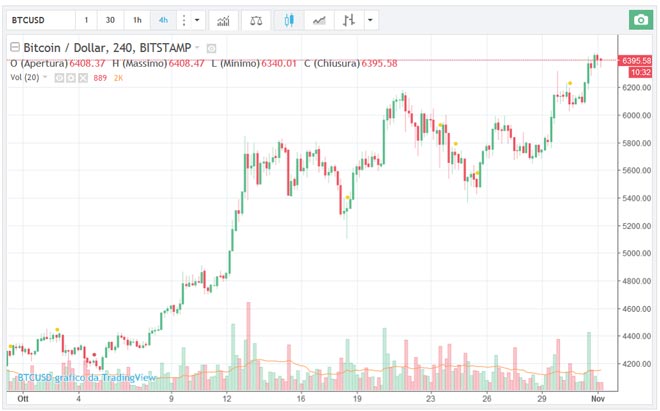 Nel solo mese di ottobre la quotazione del Bitcoin è passata da 4.250 a 6.400 dollari, un rialzo di circa il 50% in soli 31 giorni.