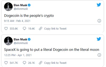 L'ascesa di Dogecoin è stata supportata anche dal successo della quotazione diretta di Coinbase, la principale piattaforma di trading di criptovalute, e dall'approvazione di celebrità sui social media. Il CEO di Tesla Elon Musk è stato un costante sostenitore di Dogecoin, pubblicizzandolo come la sua criptovaluta preferita, e i suoi post a volte hanno portato a picchi nel suo valore.
