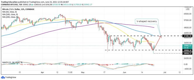Una ripresa a forma di V entra in vigore quando un asset scende in modo massiccio prima di effettuare una ripresa sostenuta. Ad esempio, attualmente, BTC scambia sopra 32.000 in mezzo alla spinta dei rialzisti che punta diretta verso l'obbiettivo dei 40.000 dollari. Se questo modello non viene interferito da ulteriori venti contrari, prevediamo che il prezzo del BTC aumenterà notevolmente prima di imbattersi in una resistenza significativa a 41.000 dollari.