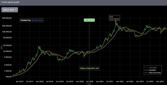 Il canale YouTube sulla criptovaluta ‘The Moon”, gestito da Carl Eric Martin, è andato su Twitter per condividere il grafico sottostante che segue la corsa rialzista di Bitcoin nel 2017 e la traccia ai massimi potenziali fino a gennaio 2024.