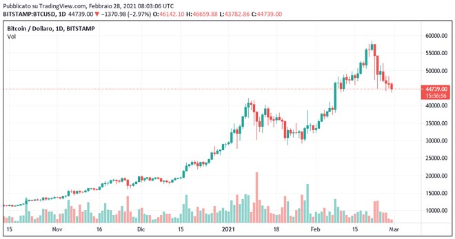 Prosegue la fase ribassista del Bitcoin che, dopo aver raggiunto i massimi storici sopra ai 58.000 dollari il 21 febbraio, è crollato rapidamente verso i 44.000 dollari per poi provare un rimbalzo superando ancora una volta i 50.000 dollari, ma per essere nuovamente “abbattuto” dalla resistenza a 52.000 dollari.