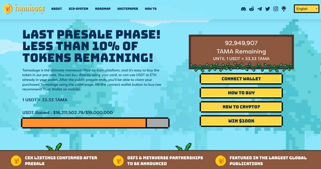 Il token TAMA di Tamadoge è attualmente nella fase generale di prevendita che sta andando molto bene. Finora, il team di Tamadoge ha raccolto oltre 16 milioni di dollari e il ritmo di crescita sta accelerando. È possibile acquistare token TAMA nativi in prevendita fino a ottobre 2022, quindi sbrigati a prenderne un po’ finché sono disponibili.