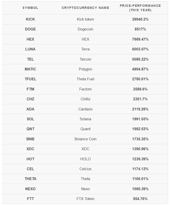 Per aiutare a prendere decisioni di investimento a lungo termine, questo articolo raccoglie le migliori criptovalute sul mercato in base alle prestazioni da inizio anno. Tuttavia, questo non vuol dire che queste siano le migliori criptovalute sul mercato oggi e nemmeno che saranno i migliori in futuro. Nessuno sa come si comporteranno i mercati nel futuro.