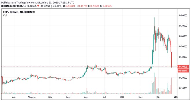 Il motivo del tracollo di Ripple è dovuto dalle notizie della causa legale mossa da Securities and Exchange Commission (SEC) degli Stati Uniti che ha citato in giudizio il presunto creatore del token, Ripple Labs Inc., per aver condotto un'offerta di titoli non registrata. La SEC accusa Ripple e i due dirigenti di aver raccolto oltre 1,3 miliardi di dollari tramite “un'offerta di titoli digitali non registrata e ancora in corso“, avviata nel 2013.