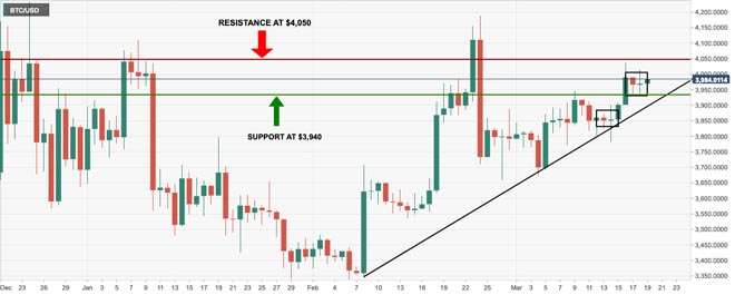 I tori sono tornati sul Bitcoin; la criptovaluta si riavvicina a quota 4.000 dollari, una rottura di questo livello psicologico potrebbe innescare una nuova corsa dei prezzi.