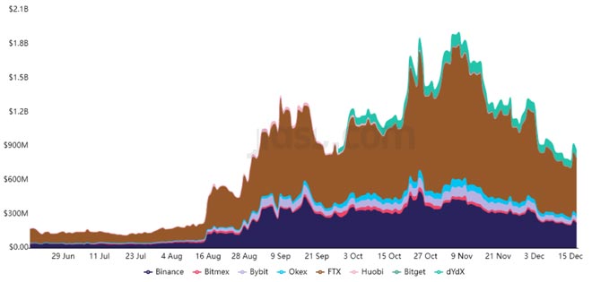 Nonostante il forte calo dal picco dell'8 novembre a 1,9 miliardi di dollari, l'attuale open interest di future da 860 milioni di dollari classifica Solana il terzo mercato dei derivati per dimensione. Ad esempio, i futures Binance Coin (BNB) detengono $ 520 milioni, seguiti da Terra (LUNA) con $ 430 milioni.