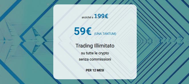 Con adesione all’esclusiva offerta promozionale TRADING COMMISSIONI ZERO, l’utente con un addebito commissionale di 59 euro (una tantum) ha la possibilità per 12 mesi di effettuare transazioni illimitate di acquisto e vendita di criptovalute presenti nella piattaforma Cryptosmart.