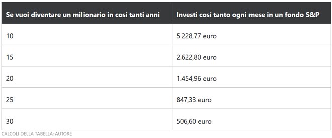 Ricorda, se hai una linea temporale breve periodo, c'è un rischio molto maggiore di non raggiungere il tuo obiettivo, dal momento che l'S&P 500 ha registrato in passato qualche anno negativo e non sempre ha fornito un rendimento del 10% ogni anno. E, naturalmente, con una breve sequenza temporale di investimento, il tuo investimento mensile deve essere molto più alto per avere anche la possibilità di accumulare una fortuna da un milione di euro, dal momento che hai meno tempo per far crescere i tuoi soldi.