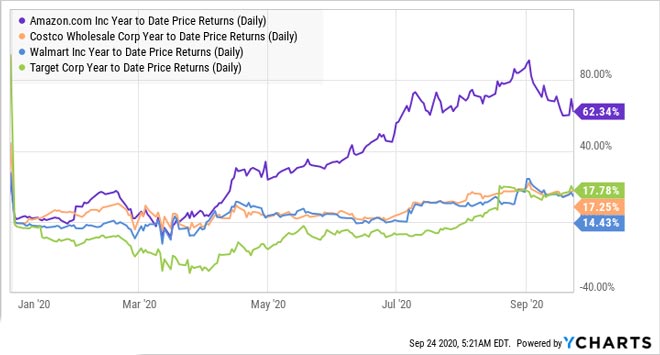 Costco e Amazon hanno entrambi beneficiato della pandemia poiché i consumatori si sono concentrati sull'essenziale e sono passati agli acquisti online, così come la maggior parte degli altri fornitori di prodotti essenziali come Walmart e Target. Ma le vendite di Amazon sono cresciute del 40% durante il trimestre terminato il 30 giugno, poiché i membri Prime e altri acquirenti di Amazon hanno investito i loro soldi nel nome su cui fanno affidamento. La decisione di Amazon di aprire la sua piattaforma a terze parti si è rivelata un fattore importante per il suo successo, poiché le vendite di terze parti sono cresciute più delle vendite dirette da Amazon.