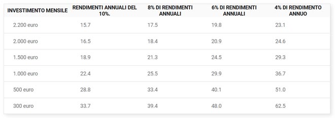 La tabella seguente mostra quanti anni ci vogliono per raggiungere lo status di milionario, a seconda di ciò che puoi risparmiare ogni mese e del tasso di rendimento annuo che guadagni lungo il percorso.