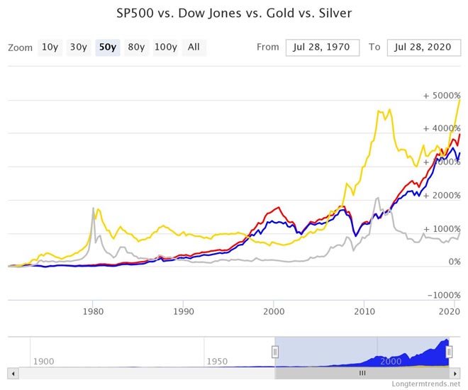 Sebbene sia l'oro che l'argento siano un buon investimento durante i periodi di crisi, la loro utilità come investimento a lungo termine è discutibile. l'oro ha sottoperformato sia l'S&P500 che il Dow Jones negli ultimi 10, 30 e 100 anni.