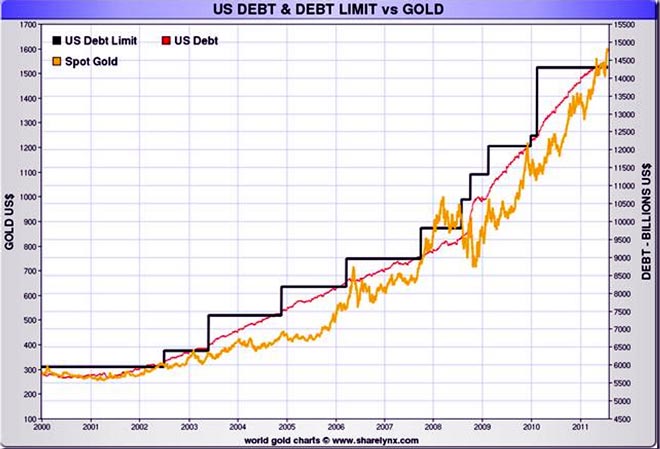 L'oro sembra aumentare (in termini di USD) in correlazione quasi perfetta al tetto del debito degli Stati Uniti.