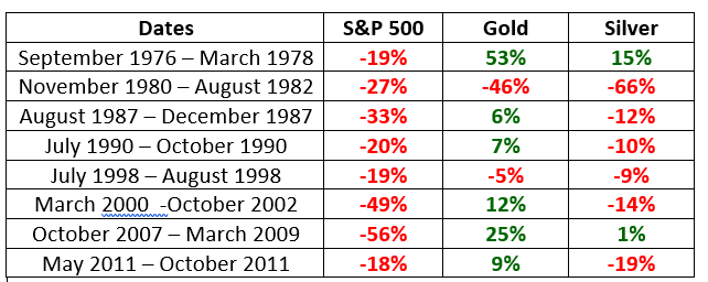 Da ottobre 2007 a marzo 2009, l'S&P500 è sceso di oltre il 55%. Tuttavia, il prezzo dell'oro è aumentato di oltre il 25% durante lo stesso periodo. Anche l'argento, pur non essendo alto come l'oro, è aumentato dell'1%.