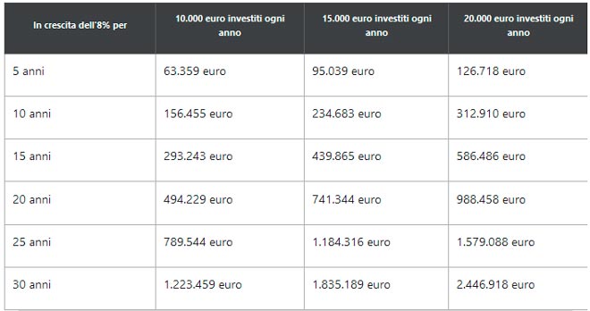 È anche importante investire regolarmente somme relativamente grandi, per ottenere i migliori risultati. La tabella seguente mostra quanto potresti accumulare se lo fai.