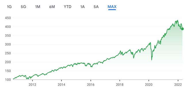 Se rimpicciolisci il grafico dell'ETF Vanguard 500 Index Fund (VOO), vedrai una tendenza abbastanza coerente dalla parte inferiore sinistra del grafico all'angolo superiore destro.