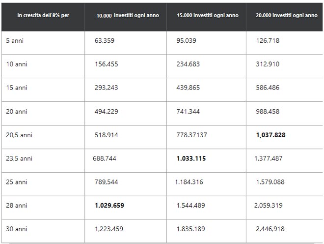 La tabella prende come riferimento un tasso di crescita annuo dell’8% e questo è una performance un po’ prudente in quanto, per lunghi periodi, il rendimento medio del mercato azionario è stato di circa il 10%, ma un investitore potrebbe avere una media di poco o molto più o meno a seconda del periodo specifico in cui investe.