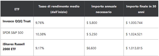 È possibile accumulare 1 milione di dollari investendo in ETF. Ma se potresti diventare un milionario o meno investendo in ETF dipende da una serie di fattori come il tasso di rendimento medio che avresti ricevuto e la quantità di denaro che stai investendo. Ecco quanto avresti dovuto investire annualmente in questi popolari ETF per far crescere il tuo conto fino a 1 milione di dollari in 30 anni.