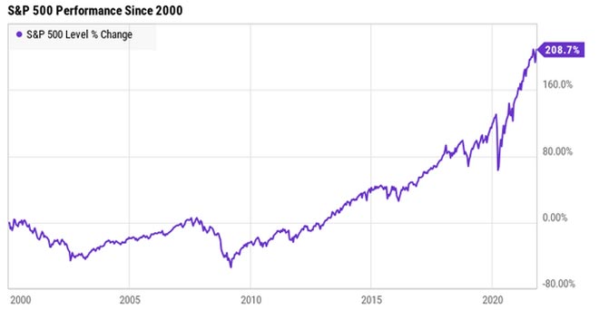 Questo non significa necessariamente che guadagnerai ogni anno; il mercato azionario può attraversare volatilità a breve termine, quindi mentre alcuni anni potresti guadagnare rendimenti superiori alla media, altri anni potresti vedere perdite. Tuttavia, nel corso dei decenni, questi alti e bassi hanno sempre raggiunto una media positiva.