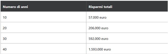 Più risparmi ogni mese, più guadagnerai nel tempo. Ad esempio, se sei in grado di investire 500 euro al mese anziché 300 euro al mese, raggiungeresti un milione di euro in poco più di 30 anni. Dopo 40 anni, avresti un capitale di quasi 2,7 milioni di euro.