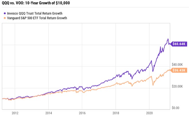 Due ETF che hanno prodotto rendimenti strabilianti nell'ultimo decennio, stiamo parlando di ETF Invesco QQQ e Vanguard S&P 500; qual è il migliore investimento nel 2021?