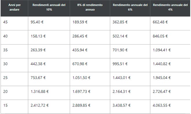 Anche se non sei in grado di investire l'intero importo di cui avresti bisogno, in base a quella tabella, iniziando ora a mettere i tuoi soldi al lavoro per te.