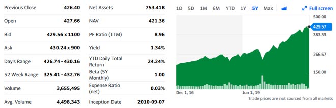 Questo il grafico dell’andamento dell'ETF Vanguard S&P 500 (VOO) degli utlimi 5 anni (fonte finance.yahoo.com)