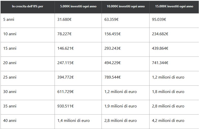 Il mercato azionario ha un tasso di crescita medio annuo vicino al 10% su lunghi periodi, che può far crescere la tua ricchezza a un ritmo decente. Nell’arco del tempo di investimento, tuttavia, potrebbe essere in media inferiore (o superiore) Al 10%. Quindi, per essere un po’ prudenti, ecco come i tuoi soldi potrebbero crescere calcolando un risultato annuo dell’8%:
