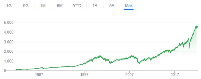 L'indice S&P 500 è una delle migliori rappresentazioni del mercato azionario nel suo insieme. Quindi, quando investi in un ETF S&P 500, stai essenzialmente seguendo il mercato la crescita del mercato azionario americano nel suo insieme. Questo può ridurre il rischio, perché sebbene il mercato azionario sperimenti volatilità a breve termine, storicamente si è sempre ripreso dalle flessioni per ottenere rendimenti positivi nel tempo. Il grafico sotto ne dimostra l'andamento.