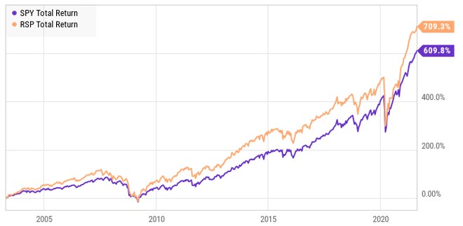 Il grafico sotto mette in confronto le performance dei due ETF SPDR S&P 500 Trust (SPY) e Invesco S&P 500 Equal Weight (RSP)