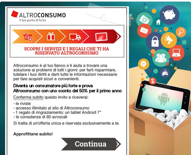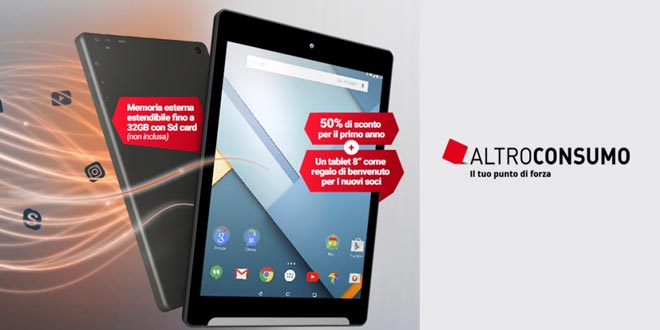 Grazie alla nuova promozione, è possibile di entrare nel mondo Altroconsumo e di ricevere gratuitamente casa un Tablet Android con uno sconto per il primo anno del 50% (7,96€ al mese).