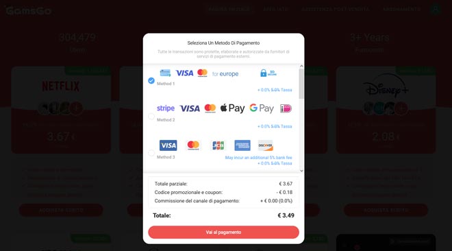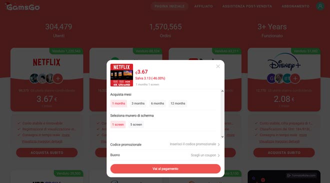 Attivare il servizio di condivisione su GamsGo è estremamente facile. Dopo essersi registrati, non devi fare altro che scegliere il servizio streaming preferito direttamente dalla homepage, cliccare su acquista, selezionare la durata e il numero degli account, inserire il codice Z8ADU per avere uno sconto sui servizi e infine cliccare ‘vai al pagamento'.
