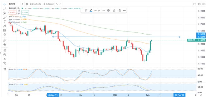 L’EurUsd, che alle 14.30, appena prima che iniziasse la conferenza stampa, quotava 1.1280 con un minimo realizzato a 1.1265, è letteralmente schizzato al rialzo con un movimento che nell’arco di 3 ore ha raggiunto quota 1.1450, 185 pips di movimento che non si verificavano da molto tempo, e più precisamente dal 19 marzo 2020 all’apice della tensione legata allo scoppio della pandemia quando l’Euro scese da 1.0960 a 1.0660 in una sola seduta operativa. Tutti i cross dell’Euro hanno vissuto una giornata di gloria con l’EurGbp in particolare, che, in ragione anche del rialzo dei tassi in Uk, è salito da 0.8285 a 0.8420.