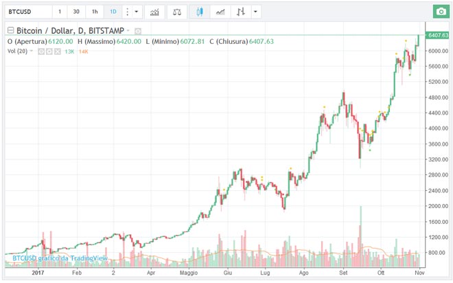 Mentre scriviamo la quotazione del Bitcoin sta segnando un nuovo record a 6.410 dollari, con un rialzo superiore al 4,5%.