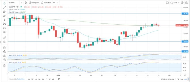 Solo il UsdJpy ha trovato ancora un muro invalicabile per ora in area 135.20 30, ed è tornato sui primi supporti. La ragione è legata all’uscita del dato questa notte relativo all’inflazione, salita al 4.3% nel mese di Gennaio. Si tratta del dato più alto, pensate, dal 1981, ed è legata all’aumento delle materie prime importate e dalla debolezza dello Jpy.