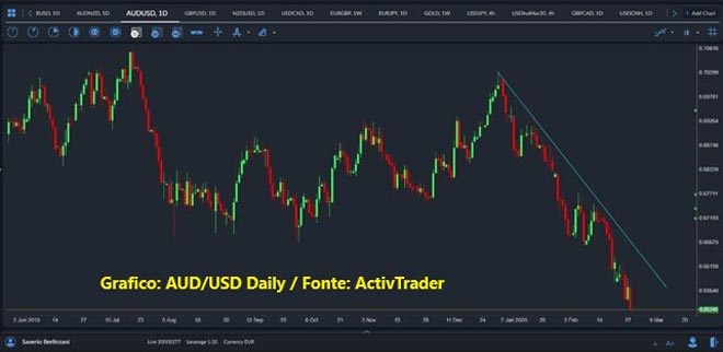 A questo punto, nell’anno delle elezioni americane, come reagirà Trump, che ha sempre professato ottimismo incondizionato, rispetto a quanto accade? Certamente non avrà parole dolci per la Fed e per Powell, e probabilmente, l’intervento a sostegno dei mercati da parte delle autorità monetarie Usa, sarà ancora una volta, come quasi sempre è accaduto in passato, la chiave per comprendere i movimenti futuri. Un taglio del costo del denaro da parte della Banca Centrale Usa, potrebbe spingere i mercati a muoversi in due sensi e a correggere, alleggerendo una pressione che sta aumentando in modo significativo. Ciò che sorprende comunque, nei movimenti visti questa notte, è la discesa dell’Oro che in un momento di tale avversione al rischio, si è fatto 10$ di ribasso, niente di che direte voi, ma in un contesto di crollo dei mercati azionari, a nostro avviso è tanta roba, per dirla in gergo. Il petrolio scivola costantemente e siamo ormai sotto i 46 dollari al barile, così come nel mercato valutario lo Jpy è tornato la valuta rifugio per eccellenza e si è fatto da 112.20 a 109.00, ovvero circa il 3% in 5 sedute e per una valuta liquida come UsdJpy non è poco. Continuano invece le discese di AudUsd e NzdUsd, in un contesto che le vede come valute da investimento rispetto anche al dollaro Usa e ciò pare obiettivamente una anomalia in quanto a ben vedere, un recupero della Cina dovrebbe invece favorirle. Ma il mercato per ora le bastona.