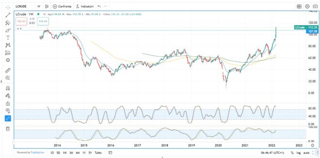 Il mese di marzo è iniziato come quello del 2020 quando, ricorderete, la pandemia era esplosa in tutta la sua virulenza, e i mercati vissero una fase di paura e panico degna di altri tempi. Abbiamo la netta sensazione che potremmo vivere qualcosa di simile, anche se probabilmente in forma diversa. Ma ovviamente tutto dipenderà dall’evoluzione del conflitto russo ucraino. Per chi opera di medio e lungo termine siamo anche vicino a livelli che sembrano realmente interessanti, come il petrolio, ma anche il Gold.