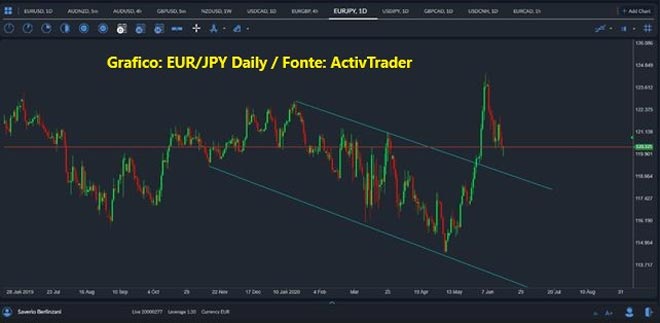Ritornando alle price action, l’unica vera novità è il ribasso del UsdJpy in una giornata di correzione dei mercati azionari, mentre gli altri cambi non hanno visto una ripresa sostanziale del dollaro che non fosse anch’essa una piccola correzione. Pertanto per ora è un risk off potenziale che si esprime con un leggero declino di UsdJpy, che da 107.60 ha perso circa un centinaio di pips, trascinando con se l’EurJpy arrivato a toccare quota 119.80. Rispetto ai massimi fatti registrare il 5 giugno a 124.45, oggi dopo 9 sedute, il prezzo ha perso circa il 4%. Tecnicamente non siamo lontani da livelli assai interessanti, quell’area compresa tra 119.20 e 118.80, in cui passa la trendline del vecchio canale ribassista, rotto poi al rialzo a fine maggio, per la precisione il 29 maggio a 119.30. Ora si potrebbe andare al retest, per poi evidenziare eventualmente una ripartenza del cross che nel medio termine rimane in correzione ribassista di un più ampio rialzo che ha come target 127.50 e oltre.