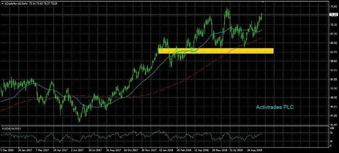 Il Petrolio (contratto CFD ActivTrades LCrudeNov18) continua nella sua fase di crescita, spinto dai timori di una mancanza di Oil a seguito delle sanzioni Usa contro le esportazioni di greggio iraniano e dall'apparente riluttanza dei paesi Opec e della Russia ad aumentare la produzione per compensare l'impatto sull'offerta globale delle misure statunitensi.