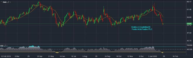Barclays ha dichiarato che i prezzi del petrolio saranno influenzati per circa $2 al barile sulla potenziale ricaduta economica dell'epidemia di coronavirus in Cina, poiché i timori dei virus minacciano la domanda. Al momento il livello di #supporto è in area $52 dove la situazione di ipervenduto potrebbe spingere ad un rimbalzo le quotazioni. Tuttavia una rottura al ribasso potrebbe spingere il contratto LCrude in area $48.