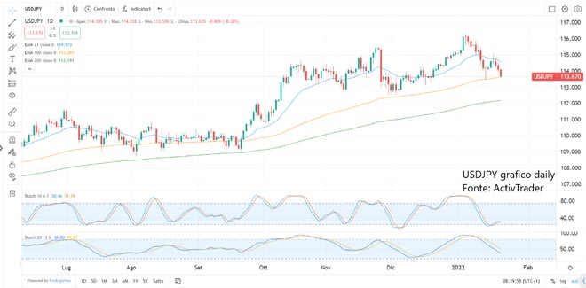 Sul fronte valutario segnaliamo la discesa di tutti i cambi contro Jpy, in ragione del ritorno della valuta rifugio per eccellenza. CadJpy ha rotto 90.60 e sembrerebbe avviato al test dei supporti chiave posti a 0.8980. UsdJpy si trova in area 113.60-70 e parrebbe avere ancora un momentum ribassista, con obiettivo 112.50-60. E’ chiaro che molto dipenderà da come apriranno i mercati lunedì e quali saranno le conseguenze delle price action dopo la pubblicazione dei dati estremamente importanti di questa settimana che paiono, insieme alle decisioni delle banche centrali. Nei prossimi giorni infatti il calendario macroeconomico prevede le decisioni di politica monetaria per la Federal Reserve e la Bank of Canada, senza dimenticare che saranno pubblicati i Pmi negli Usa, Regno Unito, Eurozona, Giappone e Australia. Ma a catturare l’attenzione ci sarà anche il Pil di Usa, Germania, Francia, Spagna e Corea del Sud. Infine da non sottovalutare i numeri sull’inflazione del quarto trimestre per Australia e Nuova Zelanda, Una settimana quindi densa di appuntamenti, con la volatilità che potrebbe drasticamente aumentare.