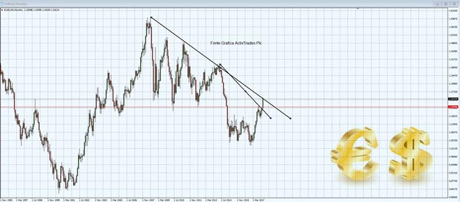 Sarà interessante vedere oggi Mario Draghi come giustificherà questi attacchi e il rinforzo dell’euro, che in nottata a bellamente superato 1,24 . A 1,23 passa una importante trend line mensile (vedi grafico) e se la chiusura settimanale si attestasse su questi livelli certo non sarebbe un buon segnale per le nostre borse, dove già Ue conferma che comunque l’applicazione dell’addendum sugli Npl potrebbe slittare di qualche mese ma non verrà revocata.