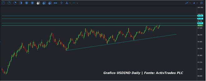 Il UsdCnh resta vicino ai massimi sopra 6.9300 con la linea maginot a 7.0000, come più volte ha ribadito anche la Pboc, pronta ad intervenire. Osservando il dollar index, si nota come la fase di rialzo non sembri terminata, con la tripla resistenza di 97.90 98.00 a fare da ultimo baluardo prima eventualmente di ulteriori accelerazioni che potrebbero portare i prezzi verso l’area di 98.30 e poi addirittura 99.50 e 100.00 che non si vedono dal maggio del 2017.