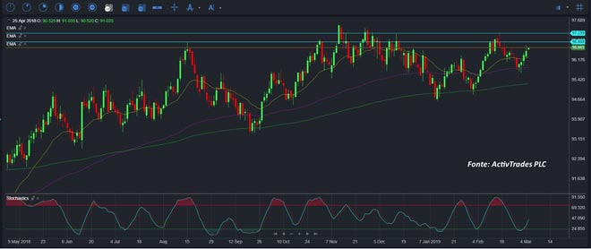 In giornata attenzione alle parole di Carney alla Camera. Domani sarà la volta della decisione della Bank of Canada sui tassi, attesi invariati all’1.75% mentre Giovedì sarà la volta di Draghi e della Bce. Lo scenario, difficilmente cambierà, però stiamo arrivando su livelli interessanti di dollar index, che trova resistenze importanti nell’area 96.40 80 (ora siamo a 96.20), quindi un altro 0.40% 0.50% prima di vedere probabilmente una correzione o una inversione. L’area chiave di medio termine è comunque posizionata a 97.25, l’1% dai livelli attuali.
