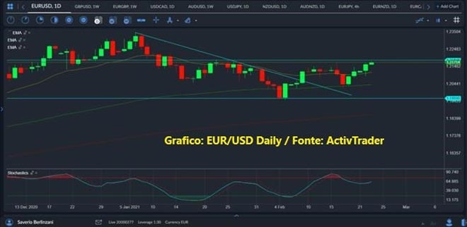 L’EurUsd ha proseguito nel suo lento incedere rialzista, arrivando fino a 1.2175-85 area, di fatto la resistenza chiave. Non hanno inciso, in questo movimento, né le parole di Janet Yellen, segretario al Tesoro Usa che ha accuratamente evitato di parlare di dollaro, tantomeno la testimonianza di Christine Lagarde al Parlamento Europeo, che si è comportata, riguardo alla valuta, in modo analogo.