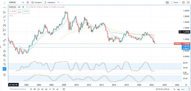 Nuovo minimo per la moneta unica, che contro dollaro va a toccare il livello più basso degli ultimi 20 anni. Il tutto, dopo aver violato l’area di 1.0330, minimo precedente del 2017. La rottura ha provocato un innesco di posizioni short che lo hanno fatto scendere altri 100 pips, e portandosi a ridosso di 1.0200. Siamo ora sui minimi del Dicembre 2002 quando l’EurUsd, che veniva dai minimi storici di 0.8225 di qualche anno prima, riuscì finalmente a violare quel fatidico 1.0220 che lo avrebbe portato poi in seguito anche a 1.3640 (Dicembre 2004) prima della grande salita a 1.6010 del Luglio 2008.