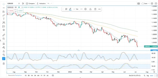 Nel mentre, la Bce resta in totale silenzio, come abbiamo già ricordato, non un cenno al valore della moneta unica, in un periodo invece nel quale i banchieri centrali sono prodighi di parole relative alla politica monetaria e agli strumenti adatti a combattere una inflazione galoppante. Nelle ultime ore sono anche state pubblicate analisi di grandi banche di Investimento, tra cui Nomura, che sull’Europa e l’Euro ha affermato che l’industria del vecchio continente, a causa del crollo del rapporto delle ragioni di scambio dell'area euro rispetto a quello degli Stati Uniti suggerirebbe un calo dell’EurUsd a 0,6500.per essere competitiva a livello globale. La stessa Nomura però prevede che l'euro scenda sotto la parità per attestarsi a 0,98 dollari nel mese di agosto e poi assestarsi a 0,95.