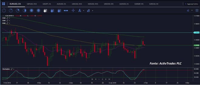 Il dollaro quindi resta vivo e molto del suo destino si gioca nell’accordo che Trump sta cercando di trovare con i cinesi. Ieri il Presidente ha rilasciato alcune dichiarazioni al riguardo dichiarando apertamente ottimismo sull’esito dei negoziati, c nella speranza concreta di trovare un accordo entro la scadenza del 1° marzo. Ha ammesso che la Cina sta aprendo il proprio mercato finanziario, e anche quello agricolo, ma ciò non basta, occorre fare di più. Per ora la Camera di Commercio Usa ha emesso un comunicato nel quale vengono ribaditi i progressi in materia di tutela dei diritti di proprietà intellettuale e accesso al mercato , mentre resterebbe ancora molto da fare sui sussidi alle industrie di Stato e sui trasferimenti di tecnologia. Per questa ragione sono previsti nuovi incontri tra il Presidente Trump e il suo omologo cinese Xi. Insomma la discussione si protrae e temiamo che vi sarà ancora molta incertezza e quindi ancora volatilità irrazionale e duplice, sui mercati, come è accaduto negli ultimi due anni sulla questione relativa alla Brexit. Per oggi riteniamo possibile che il mercato si muova solo dopo le 14.30 e dopo la pubblicazione dei payrolls dopo una settimana che è stata assai interessante sotto il profilo del trading.