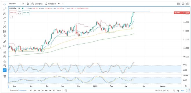 Siamo in presenza di divergenze ribassiste che potrebbero decretarne una correzione ma almeno fino a stasera, potrebbe rimanere ampiamente rialzista. Scriviamo stasera perché alle 19.00 si riunirà la Federal Reserve, attesa sicuramente ad un rialzo del costo del denaro di almeno 25 basis points. Sarà interessante ascoltare Powell per capire quanti incrementi dei tassi, la Fed potrebbe portare avanti da qui alla fine del primo semestre.