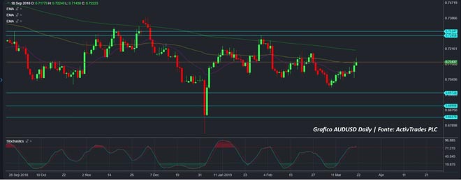 Per quanto riguarda Nzd, segnaliamo l’uscita del Pil ieri sera, dopo la Fed, con un risultato uguale alle attese per quel che riguarda la crescita del prodotto interno lordo del quarto trimestre 2018, uscito a +0.60%, mentre il dato su base annua ha visto un incremento del 2.3% contro un consensus al 2.6%. Il mercato ha reagito comunque positivamente con il dollaro neozelandese che ha realizzato un massimo a 0.6940, nell’area di 0.6940 60 già vista negli ultimi mesi, rispettivamente a Dicembre 2018 e a Febbraio 2019. Solo il superamento di quest’area potrebbe far cambiare il trend di medio termine, ancora in fase ribassista.
